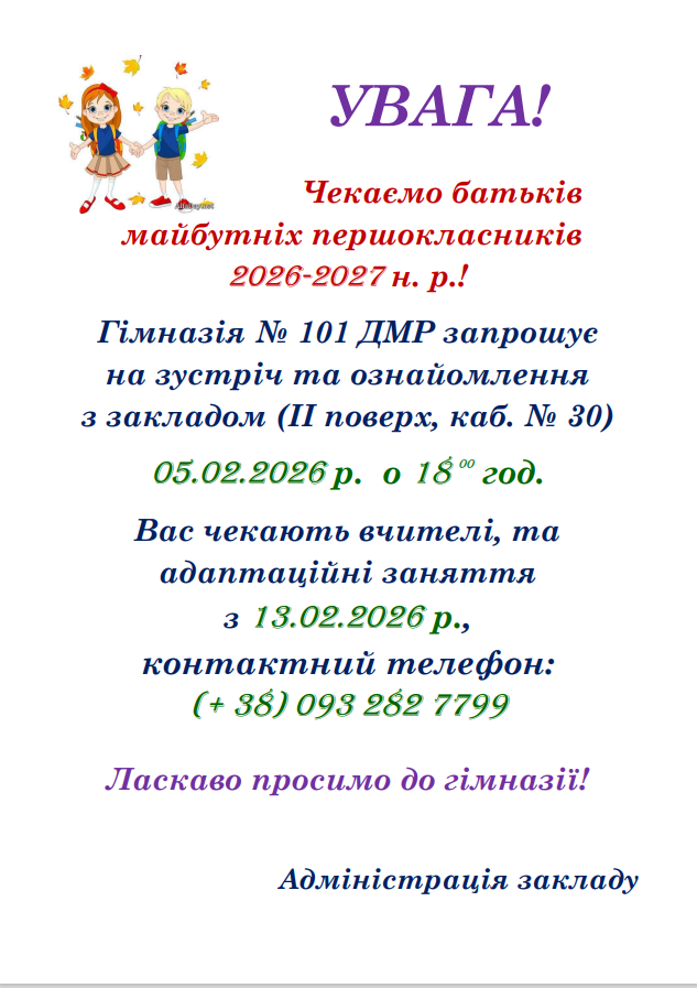 Увага! Зустріч з батьками майбутніх першокласників — 5 лютого 2026 Posted on 29.01.2026 By Ivan Merkulov Комментариев к записи Увага! Зустріч з батьками майбутніх першокласників — 5 лютого 2026 нет ОГОЛОШЕННЯ — збори — січеньСкачать Новини